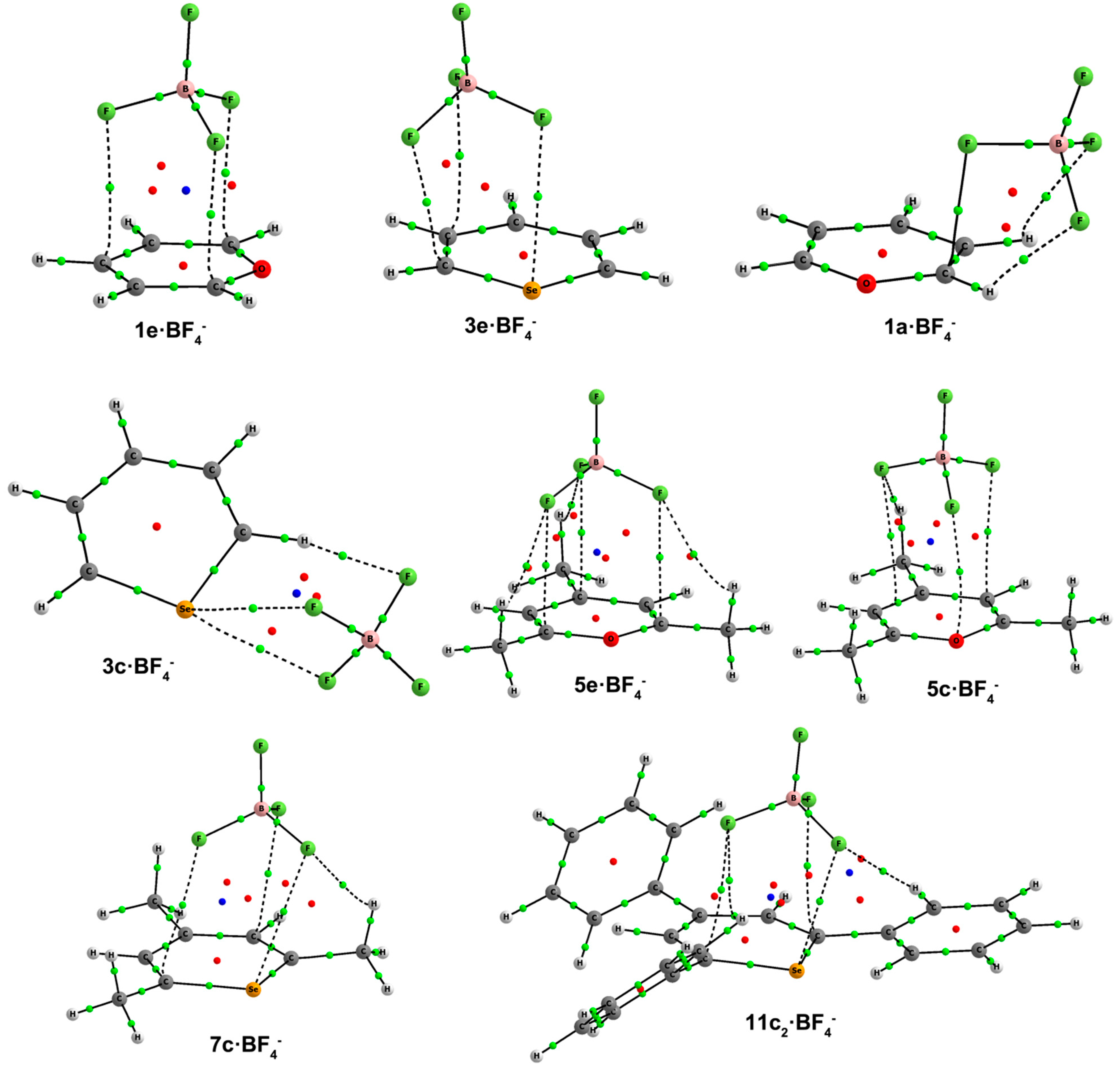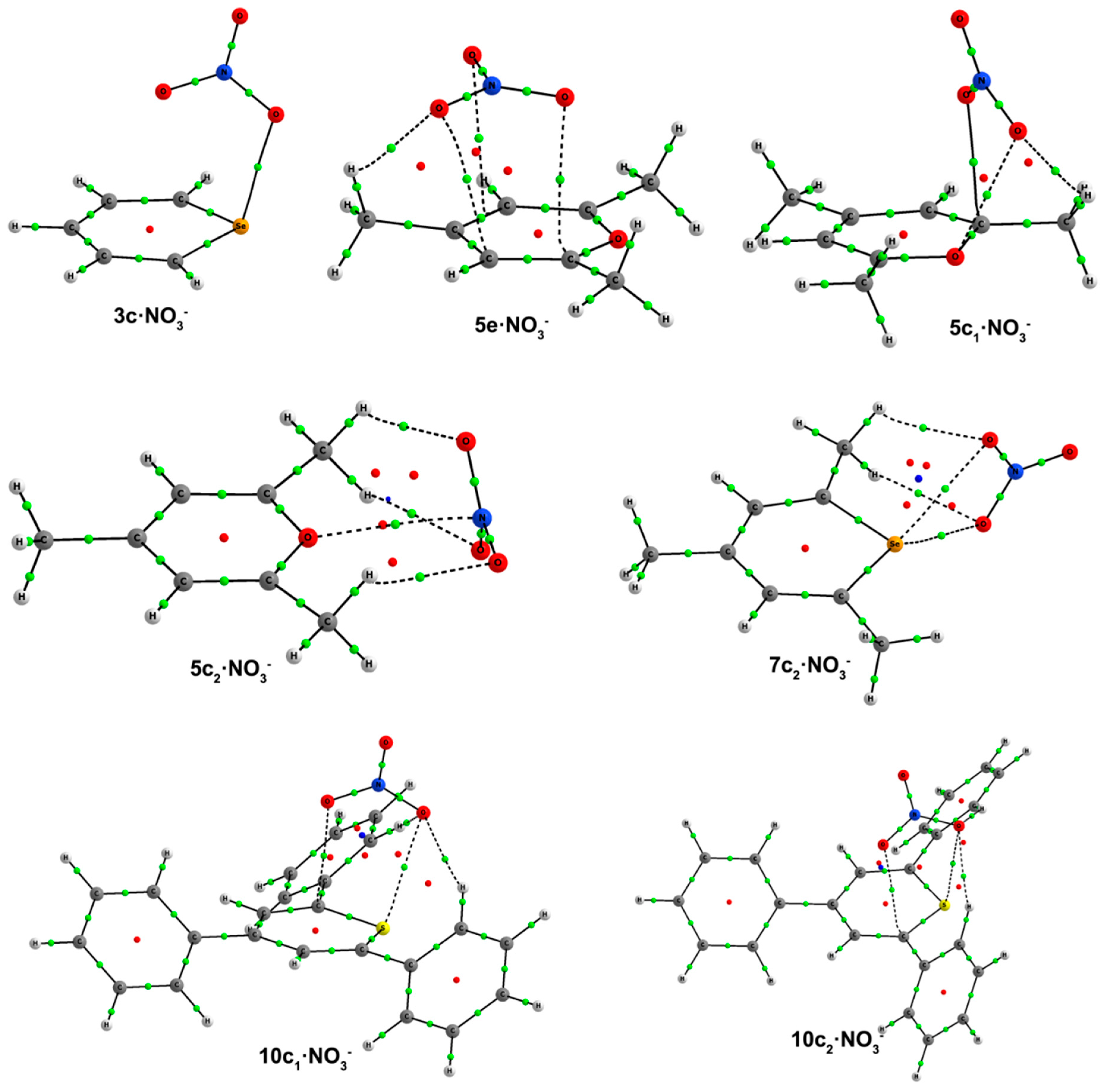 In summary, we have examined the molecular recognition in pyrylium, thio-, seleno- and telluro-pyrylium salts where anions of different morphologies were chosen, as well as different substitution of the heteroaromatic ring. The binding energy for the series of anions follows the ordering ∆ECl > ∆ENO3 > ∆EBF4, and within every family of compounds, ∆EX > ∆EX-Me3 > ∆EX-Phe3. In general, for every derivative, the most favorable a and b complexes are found for X = O. Conversely, the largest binding energies in c complexes are obtained for the most electrophilic X = Te. Complexes strictly based on hydrogen-bonding interactions (d complexes) are the least favorable. For the monoatomic chloride anion, σ-complexes are generally the most favorable structures, except for triphenyl and X = Te trimethyl complexes, where the interactions of the anion with the chalcogen atom are important. The trigonal planar nitrate σ-complexes have the largest binding energies for the unsubstituted compounds. However, for the trimethyl and triphenyl derivatives, other configurations are more important, with the O atoms of nitrate either anion-π interacting with the ring C atoms (e complexes) or establishing interactions with the chalcogen atoms (c complexes) by means of σ- and π-hole chalcogen bonds. For the tetrahedral tetrafluoroborate anion, σ-complexes could not be found, and as in nitrate, e and c complexes are predominant. These complexes present multiple intermolecular contacts (anion-π interactions and σ- and π-hole chalcogen bonds) of the F···C, F···X and F···HC type, usually resulting from the interaction of three F atoms of a single BF4– molecule with the cation. The interaction in all complexes is dominated by electrostatics. However, the induction term is especially important in chloride complexes. Finally, by analyzing the CSD, we have found several X-ray structures in which both anion-π interactions and chalcogen bonds are present, giving consistency to the computational study.