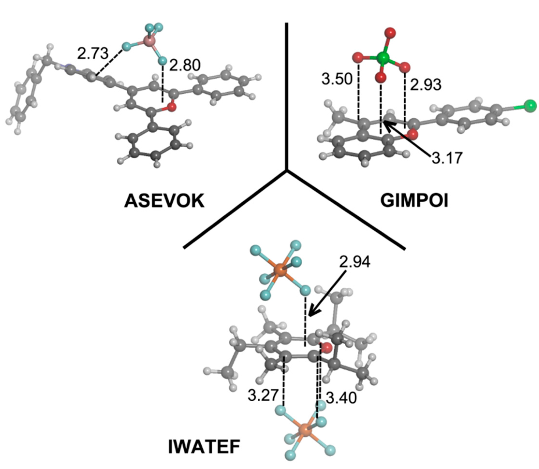While anion-π interactions continue to gain attention as their role in chemical processes is being increasingly recognized [13,14,15,16,17,18], studies of cationic oxygenated aromatic rings involved in anion-π bonding were absent in the literature until very recently [19], where the authors report an experimental and theoretical study for pyrylium-based tri-arylated series of compounds with a tetrafluoroborate anion. Pyrylium salts are a very important class of cationic organic molecules containing a trivalent oxygen atom in a six-membered aromatic ring [20,21]. They can act as intermediates for a variety of syntheses [22] and have been exploited to design sensors for anions [23], amines, amino acids and chameleon labels for quantifying proteins [24], as well as a kind of ionic liquid crystal material, which can be used in the display industry [25,26].