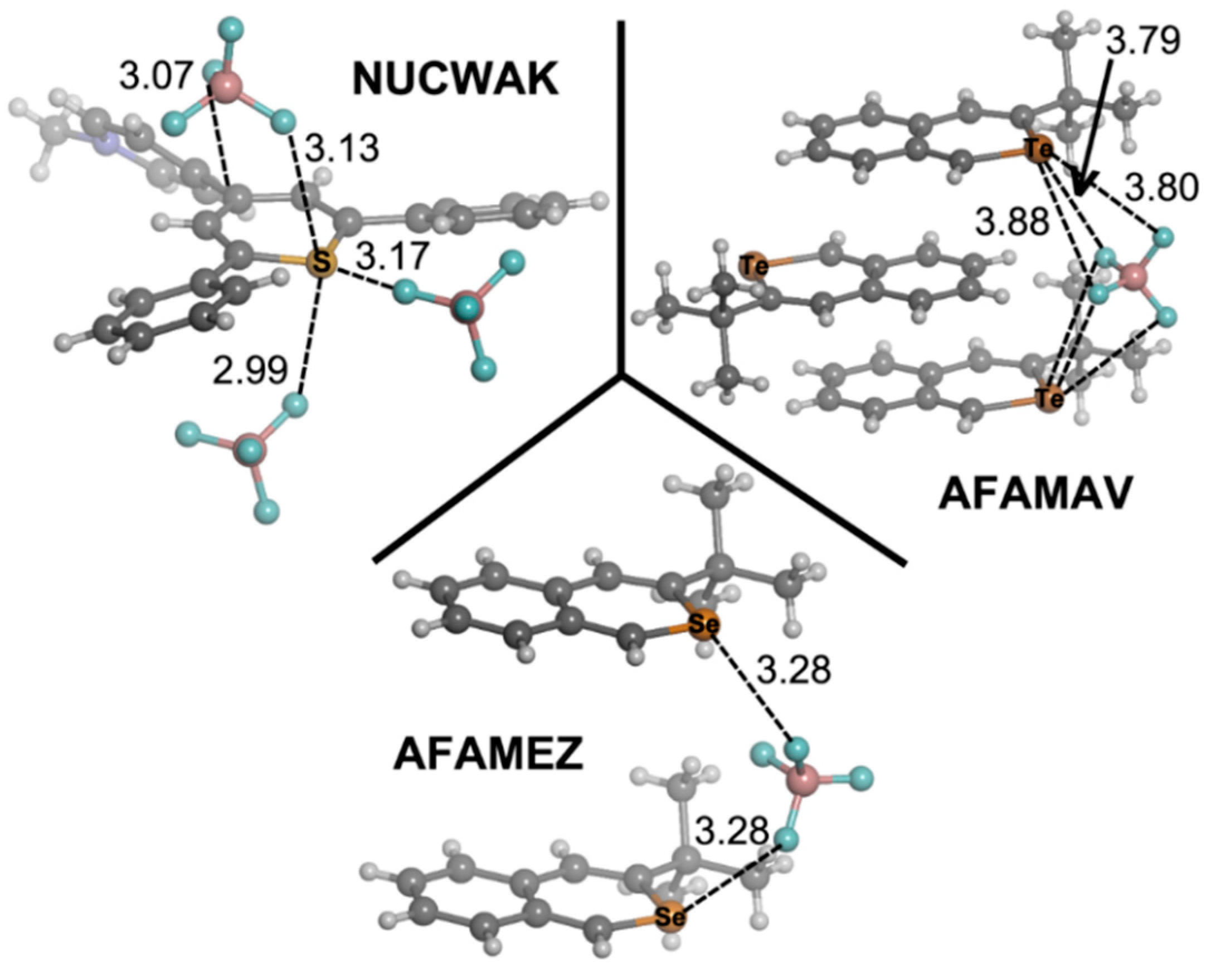 In this work, we present a systematic computational study on unsubstituted, trimethyl and triphenyl pyrylium cations (Scheme 1) interacting with Cl–, NO3– and BF4–. We chose a monoatomic, a trigonal planar and a tetrahedral anion to account for different shapes and to analyze the effects that this would have in the formation of the complexes. Moreover, we also included in our study the thio-, seleno- and telluro- analogues of the pyrylium cations previously mentioned to analyze the effect of the chalcogen atom in such complexes (Scheme 1). The variation of the chalcogen atom comes also from the idea of studying the existence of chalcogen bonds. These noncovalent contacts belong to the σ-hole interaction family, as tetrel, pnicogen, halogen and aerogen bonds, which has attracted considerable attention in recent years, and they are recognized by the scientific community as powerful tools in supramolecular chemistry, crystal engineering and biochemistry [27,28,29,30,31,32]. We have also carried out natural bond orbital (NBO), atoms in molecules (AIM) and symmetry-adapted perturbation theory (SAPT) calculations to characterize the complexes and to analyze the physical nature of the interactions.