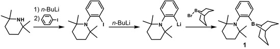 - Roesler, R.; Piers, W.E.; Parvez, M. Synthesis, structural characterization and reactivity of the amino borane 1-(NPH2)-2-[B(C6F5)2]C6H4. J. Organomet. Chem. 2003, 680, 218–222. [Google Scholar] [CrossRef]