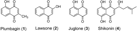Chemical structures of plumbagin (1); lawsone (2); juglone (3) and shikonin (4).
