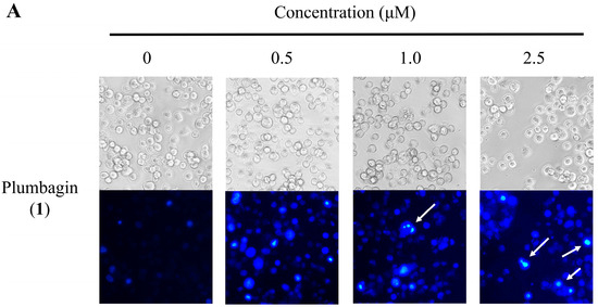 HT-29 cells were plate at 7 × 105 cells per 6-cm dish. After overnight, cells were treated with 0.5–2.5 μM plumbagin (1) and 11a for 48 h. The cells of each dish were stained with 5 mM Hoechst 33258 (Sigma-Aldrich, St. Louis, MO, USA). After the cells were incubated in a dark room for 5 min, the cells were washed with PBS and then were observed using a fluorescent microscope (Zeiss, Axio Observer A1, Göttingen, Germany).