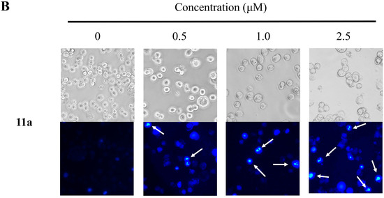 The morphological changes of HT-29 cells treated with 0–2.5 μM plumbagin (1) (A) and 11a (B) for 48 h. (magnification, 200×). (A,B) The upper panels showed the cell morphology under phase-contrast microscopy, and the lower panels display the Hoechst 33258-stained nuclear patterns take by fluorescence microscopy (magnification, 200×).
