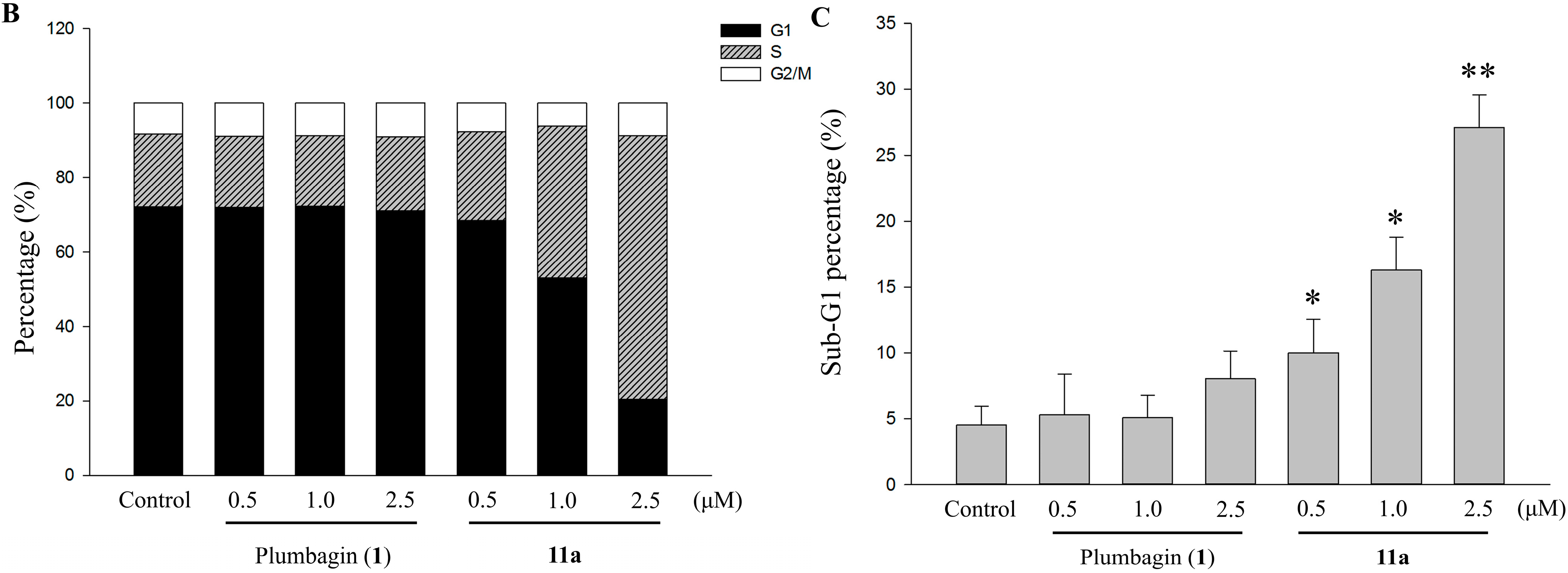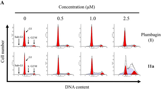 To probe the apoptotic effects of plumbagin (1) and 11a on cell cycle progression, HT-29 cells were treated once again with these compounds, separately, at different concentrations for 48 h. The cell cycle distribution of the cancer cells was analyzed by flow cytometry, and the sub-G1 phase analyzed by flow cytometry with propidium iodide (PI) staining [28]. The control of the experiment was the untreated cells. As illustrated in Figure 3, only a small fraction of apoptotic cells (0.8%) was detected in the control as well as in plumbagin (1) at a low concentration of 2.5 μM. However, as plumbagin (1) dosage increased from 0.5 to 2.5 μM, the fraction of apoptotic cell went up substantially from 4.5% to 7.6% in a concentration-dependent manner. As for compound 11a, the apoptotic effect meagerly laid between 10.7% to 27.8% across the treatment range of 0.5–2.5 μM and induced cell accumulation in the S phase.