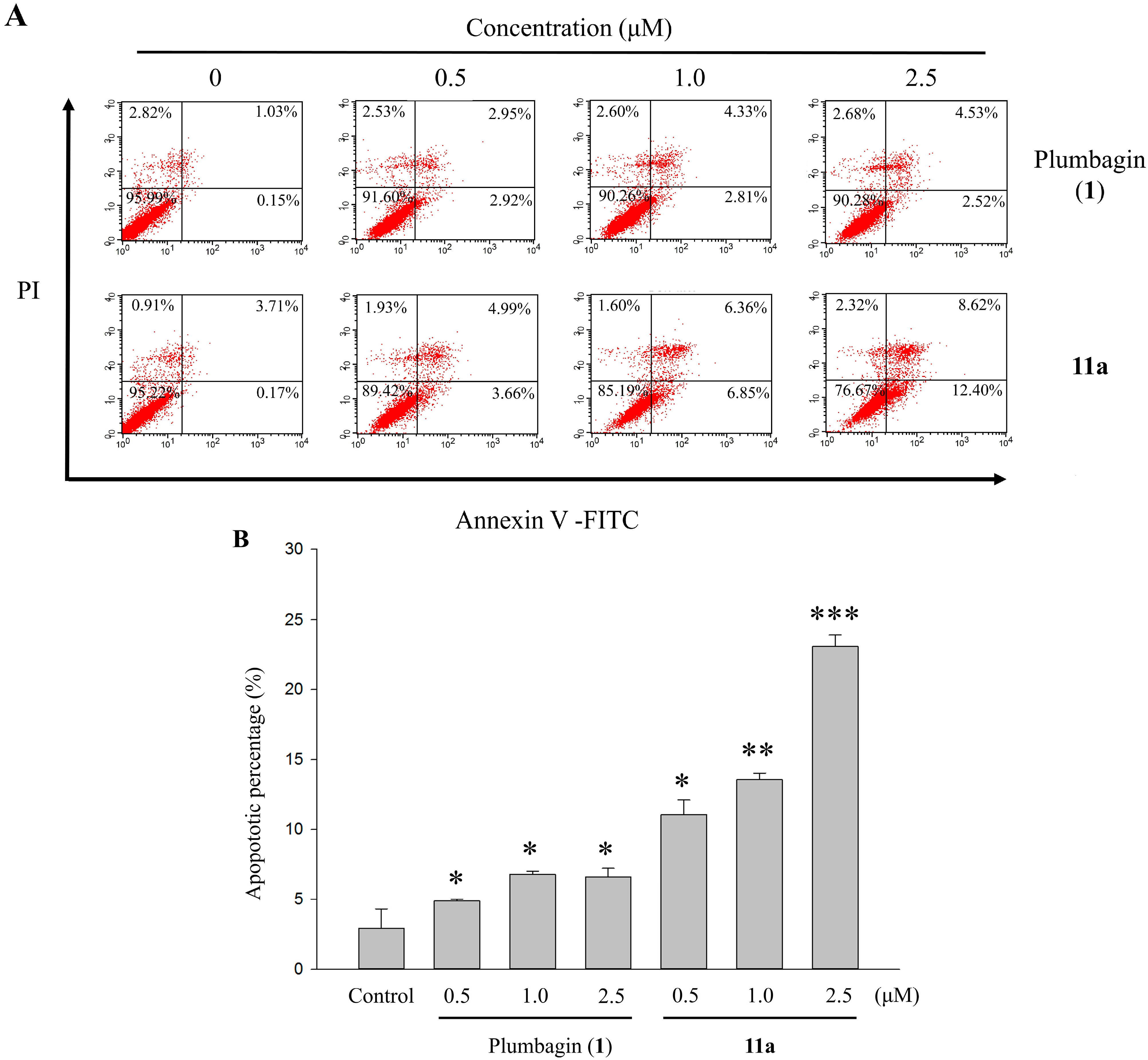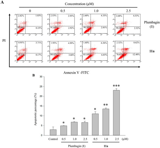 (A) The effects of the 48 h treatments with 0–2.5 μM plumbagin (1) and 11a on apoptotic percentage distribution of HT-29 cells by Annexin V-FITC/PI staining. (B) The apoptosis rate was calculated by flow cytometry and cell apoptosis was defined in early and late apoptosis treatment with 0–2.5 μM plumbagin (1) and 11a for 48 h. Each value represents the mean ± SD of three independent experiments. * p < 0.05, ** p < 0.01 and *** p < 0.001 vs. control.