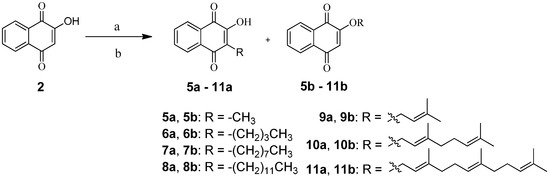 In general, 1,4-naphthoquionone derivatives were synthesized from lawsone (2) with alkyl, terpenyl, alkylamino, or morpholinealkylamino moieties through 2-O- or 3-C-alkylation. As shown in Scheme 1, synthesis of 5a,b–11a,b were carried out by reacting lawsone with selected alkyl or terpenyl bromide in dimethylformamide (DMF) using triethylamine as the base and sodium iodide (NaI) as the catalyst under N2 for 1 h according to the reported procedure [24]. The addition of an alkyl or terpenyl group to lawsone (2) gave two products at the 2-O-postion and 3-C-position in 40.0%–72.3% yield. The 3-C-substituted compounds were the major products while the 2-O-substituted compounds were obtained with a yield of less than 10%.