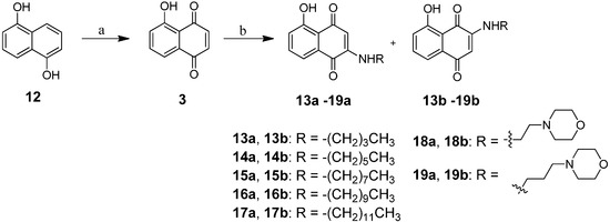 The synthesis of juglone (3) was via oxidation of commercially available 1,5-dihydroxy-naphthalene (12) in air, and dark, in the presence of periodic acid with a yield of 67.6%. Chemical transformation of juglone (3) to compounds 13a,b‒19a,b was then carried out according to the reported methods with some modifications [25]. Aminated juglone (3) was prepared by stirring it with a long chain amine in ethanol for 1 h under reflux to give 2-alkylaminojuglone and 3-alkylaminojuglone as major and minor products, respectively. Lastly, once the alkylamino substituted 1,4-naphthoquinone derivatives were obtained, other alkyl- or morpholinealkylamino-juglones were prepared by adding primary alkyl amines and morpholinealkyl amines to juglone (3) in ethanolic solution at room temperature. The two-step reaction and end products are illustrated in Scheme 2.