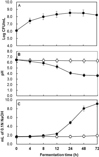 Growth (A); pH (B), and titrable acidity (C) curves during the fermentation of M. denudata extract by P. acidilactici KCCM 11614 at 30 °C for 72 h. ○, Non fermented (control); ●, Fermented.