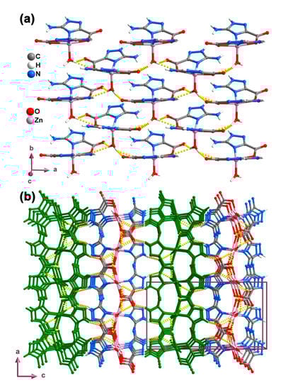 Adjacent [Zn(Hatrc)2(H2O)] complexes interact via strong hydrogen bonds leading to the formation of a 2D supramolecular structure (layers) extended in the ab plane of the unit cell (Figure 2a). The intermolecular hydrogen bonds involved in the formation of these layers are of the type O1W–H1WA···O11 and O1W–H1WA···O12 (yellow dashed lines in Figure 2a; Table 2). Neighboring layers pack close along the [001] direction and are interconnected into a 3D supramolecular architecture network via the N11–H11A···O11 interaction (orange dashed lines in Figure 2b; Table 2). Furthermore, the distance between the centroid of triazole ring and N11 is 3.510(3) Ǻ, pointing to the existence of a weak N11–H11A···π stacking interaction in the crystal structure (not shown), which also contributes for the stabilization of the 3D supramolecular architecture.