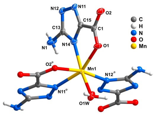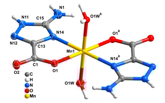 Compound 2, [Mn(Hatrc)2(H2O)2]·2H2O features a mononuclear complex (Figure 3) with the asu being composed of one metal center (Mn1), one Hatrc− anionic ligand and one coordinated water molecule. An additional uncoordinated water molecule of crystallization is, however, present. The metal center has a distorted octahedron geometry, with the equatorial plane formed by O1, N14 and their symmetrical counterparts (O1b and N14b, symmetry transformation: b: 1−x, 1−y, 1−z); O1W and O1Wb occupy the axial positions (Figure 3 and Table 1). The coordination fashion of the ligand is of type I, as that observed in compound 1. Bond-valence-sum (BVS) calculations gives a value of 2.02 for Mn1, indicating that Mn1 has the +2 oxidation state (command Calc Coord in PLATON [49]). This compound is isotypical to the already described compound [Cd(Hatrc)2(H2O)2]·2H2O [34].