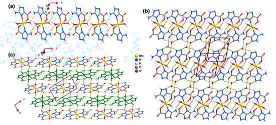 Individual [Mn(Hatrc)2(H2O)2] complexes present in compound 2 are interconnected through strong hydrogen bonds of type N–H···O1W involving the coordinated water molecules and adjacent Hatrc− residues into 1D chains running parallel to the a-direction of the unit cell (Figure 4a), forming a graph set motif of the type R22(12) [50]. Chains further grow into supramolecular layers by way of the lattice water molecules O2W, which act as bridges between adjacent chains: O2W–H2WB···O2, O2W–H2WA···N12 and N11–H11A···O2W (Figure 4b and Table 3). Layers pack along the b-axis of the unit cell mediated by hydrogen bonds, ultimately originating the extended 3D supramolecular structure in 2 (Figure 4c).