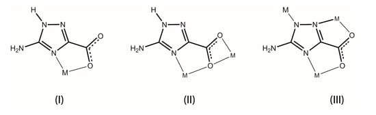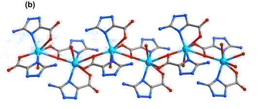 One fruitful selection of the organic building units relies on five-membered N-heterocycles, such as pyrazole, imidazole, triazole, tetrazole, which are good representatives for small and simple organic bridging ligands. 1,2,4-Triazole residues, presenting a hybrid of pyrazole and imidazole, represent a class of ligands that can combine different substituent groups, thus constituting a good building block for the preparation of metal complexes and materials with structural, optical and magnetic properties [22,23,24,25,26,27,28,29,30,31]. Herein, 3-amino-1H-1,2,4-triazole-5-carboxylic acid (H2atrc) [32], comprising a triazole ring with three N-donors and a carboxylic acid group, was chosen as the organic building unit, being expected to lead to the formation of polynuclear compounds and multidimensional frameworks. A meticulous survey in the literature and in Cambridge Structural Database (CSD, Version 5.36 updated November 2014) [33] revealed the existence of only five structures with residues of H2atrc (this molecule being the sole organic ligand). Two of these known compounds comprise discrete complexes ([Cd(Hatrc)2(H2O)2] [34] and (NH4)2[Cd(Hatrc)4] [35]), whereas the other two are isotypical 3D MOFs ([M(Hatrc)2(H2O)]n; M2+ = Sr2+ or Ba2+) [36]. The remaining compound is an interesting tubular structure formed by the crystal packing of [Cu(atrc)(H2O)] complex units, whose channels have an internal diameter of ca. 8.5 Å. Clusters of 12 molecules of water of crystallization are included in the channels [37].