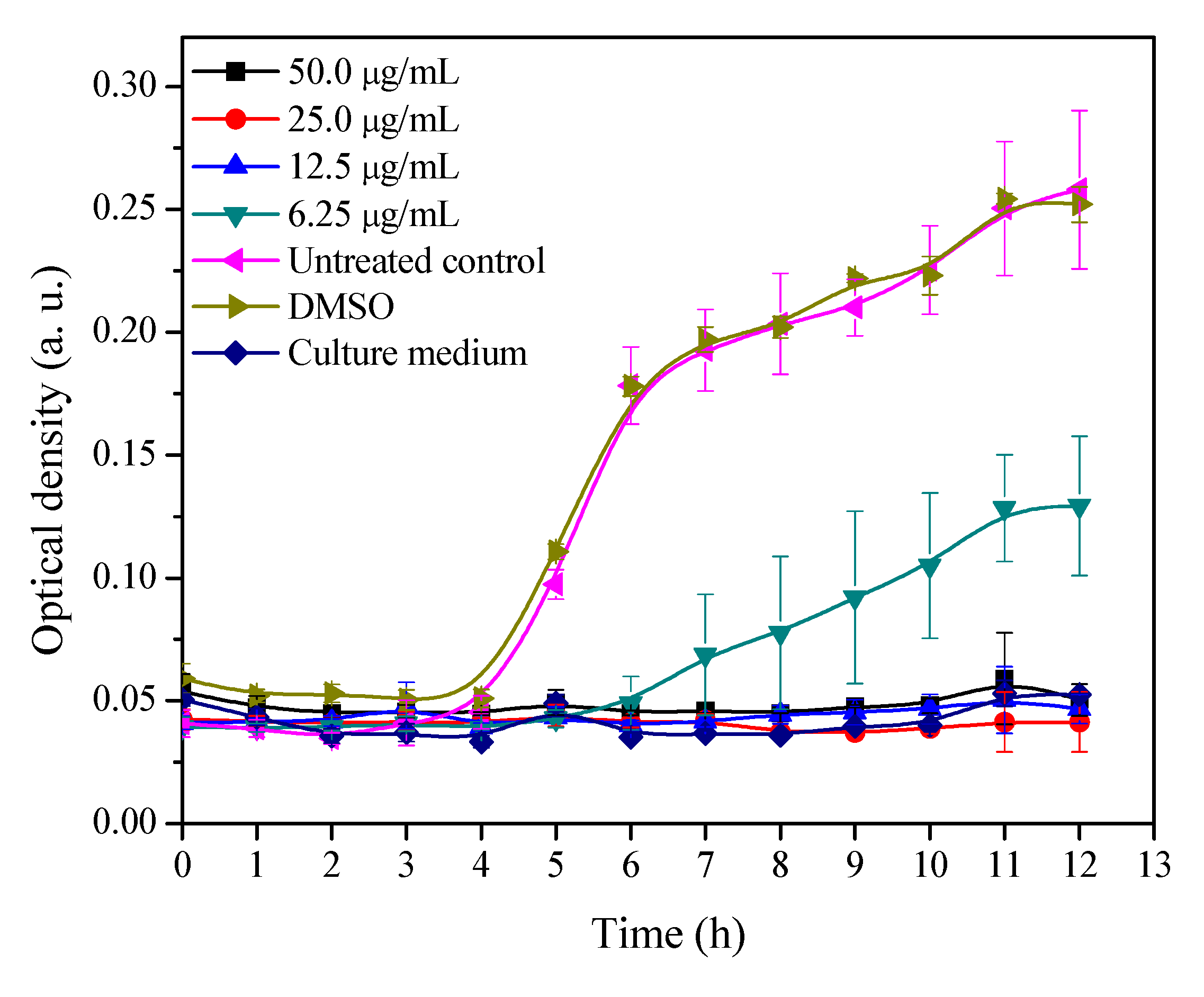 Bacterial growth-inhibitory concentration curve of 3′-demethoxy-6-O-demethylisoguaiacin against MRSA.
