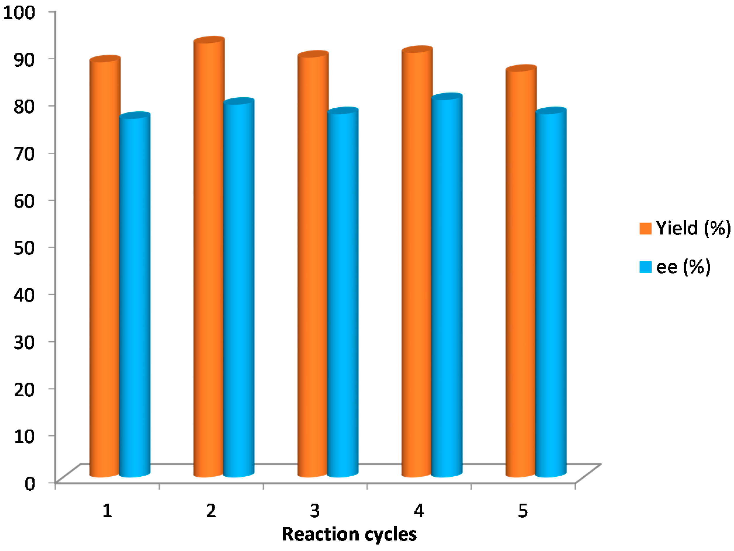 Finally, the silica-supported catalyst 5 (10 mol %) was applied under solvent-free conditions for the synthesis of compound 10a, its recovery and recyclability being studied. The results achieved were similar in terms of yields and enantioselectivities to those achieved by using catalyst 4. The catalyst was recovered by filtration after reaction completion and reused five times without observing any changes in the results (Figure 3).