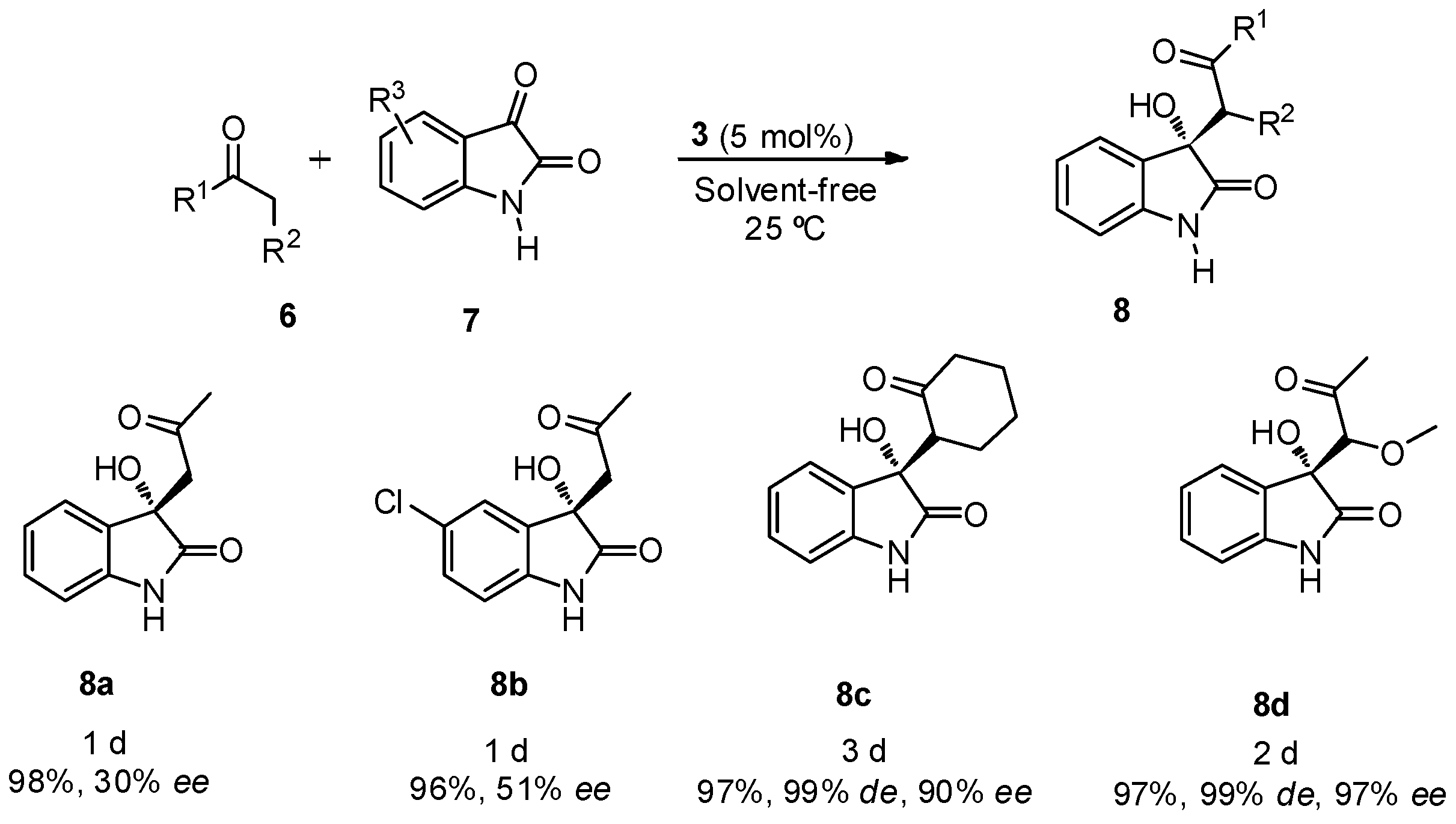 To the mixture of the corresponding isatin (0.3 mmol), and catalyst 3 or 4 (5 mol %), ketone (0.6 mmol) was added. The reaction was stirred using magnetic stirring until the isatin was consumed (monitored by TLC), then the crude product was purified by a silica gel chromatography.
