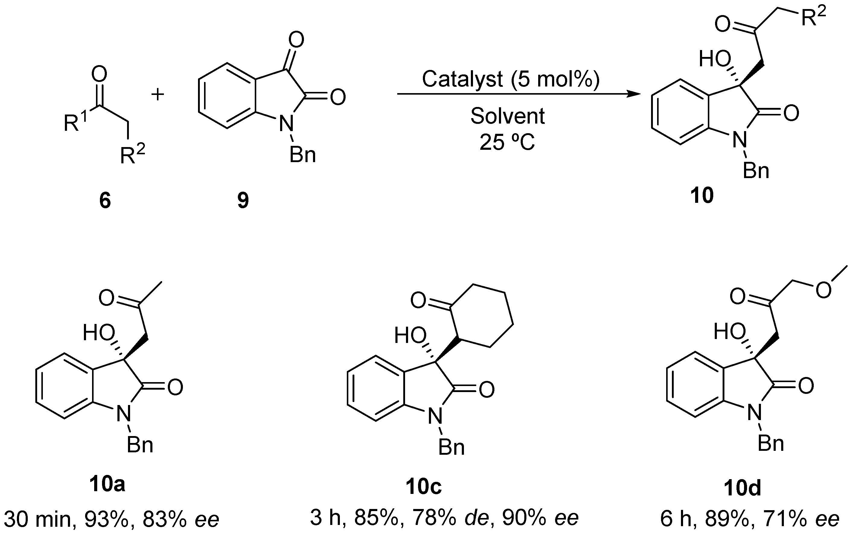 (R)-1-Benzyl-3-hydroxy-3-((S)-20-oxocyclohexyl)indolin-2-one (10c) (Product CAS number 881081-60-3). Yield 93%; 1H-NMR (300 MHz, CDCl3): δ 1.54–2.00 (m, 6H) 2.28–2.47 (m, 2H), 2.97–3.06 (m, 1H,) 3.20–3.27 (m, 1H), 4.73–4.81 (m, 1H), 4.88–5.00 (m, 1H), 6.62–6.69 (m, 1H), 6.95–7.01 (m, 1H), 7.17–7.46 (m, 7H); 13C-NMR (75 MHz, CDCl3): δ 24.1, 25.7, 27.1, 42.0, 43.5, 55.3, 76.3, 109.2, 122.8, 124.0, 125.1, 126.8, 127.5, 128.5, 128.6, 128.8, 129.6, 135.3, 143.4, 176.6, 211.3. Elemental analysis C21H21NO3: C 75.20, H 6.31, N 4.18. Found C 75.45, H 6.25, N 4.07. HPLC Chiralpak OD-H column, n-hexane/2-propanol = 95:05, flow rate 1.0 mL/min, λ = 254 nm; tR 19.25 min (major) and 45.23 min (minor).