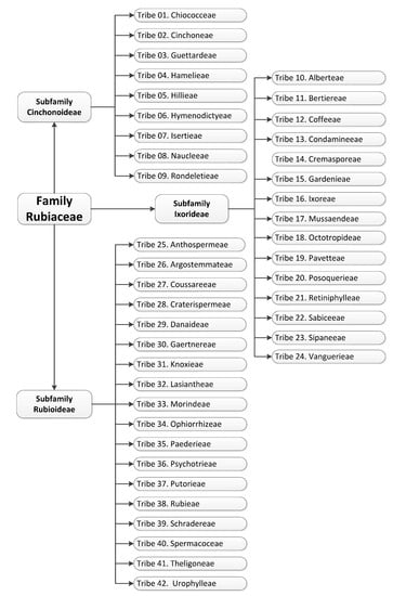The Rubiaceae family taxonomic classification is complex and there are still some gaps which have to be filled. According to the classification of Robbrecht [8], the Rubiaceae family is divided into four subfamilies: Rubioideae, Cinchonoideae, Antirheoideae and Ixoroideae. However, more recent studies suggest this family to be divided into three subfamilies: Rubioideae, Cinchonoideae and Ixoroideae, as some authors do not recognize Antirheoideae as a subfamily, since molecular studies have shown it to be polyphyletic with no standardized occurrence of a chemical marker [9,10,11,12,13,14,15,16]. Due to the abundance of species, the subfamilies were divided into 43 tribes (an intermediate clade between genus and subfamily) [16], which are listed in Figure 1.