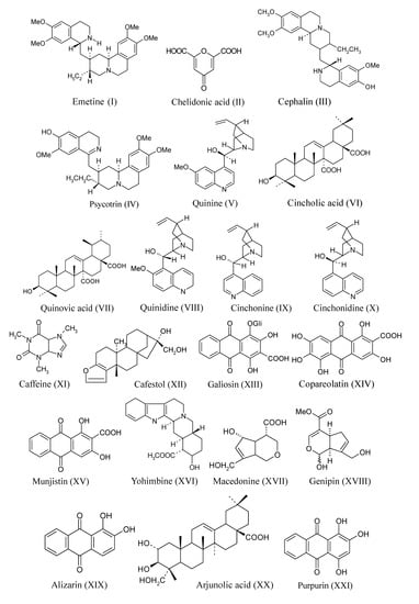 A good correlation between the biosynthetic pathways and morphological aspects of the Ixoroideae, Cinchonoideae and Rubioideae subfamilies is obtained by evaluating chemical data, combined with the parameters cited by Robbrecht [8]. Each one of these subfamilies presents a different and typical profile of indole alkaloids, iridoids and anthraquinones which are considered as Rubiaceae chemotaxonomic markers [49]. Other studies based on chemotaxonomic data obtained by gas chromatography coupled to mass spectrometry show that the iridoid glycosides are present in several different species belonging to the Rubiaceae subfamilies [50,51,52]. Monoterpene indole alkaloids, especially which are derivatives of tryptamine and monoterpene (iridoid) secologanin are another predominant class in Rubiaceae. Quinoline alkaloids, which are products from the monoterpene indole and isoquinoline alkaloids rearrangement, yielding emetine-type alkaloids, are also characteristic of Rubiaceae, however, strychnine class alkaloids are not present in this family. Other alkaloid types are quite heterogeneous leading to a hard chemotaxonomic correlation [53].