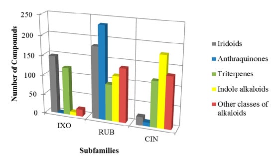 Based on the obtained data, the main occurrence of iridoids, anthraquinones, triterpenes, indole alkaloids and alkaloids belonging to different chemical subclasses, was observed. The chemical profile, as expressed by the occurrence of major categories of secondary metabolites (alkaloids, anthraquinones and iridoids) showed to be quite different for each subfamily. Furthermore, the study of specific classes may contribute to chemotaxonomic correlations, since there are compounds with restricted distribution [54]. These same classes of substances served as a distribution pattern to create and modify plant classification systems as proposed by Dahlgren [54].