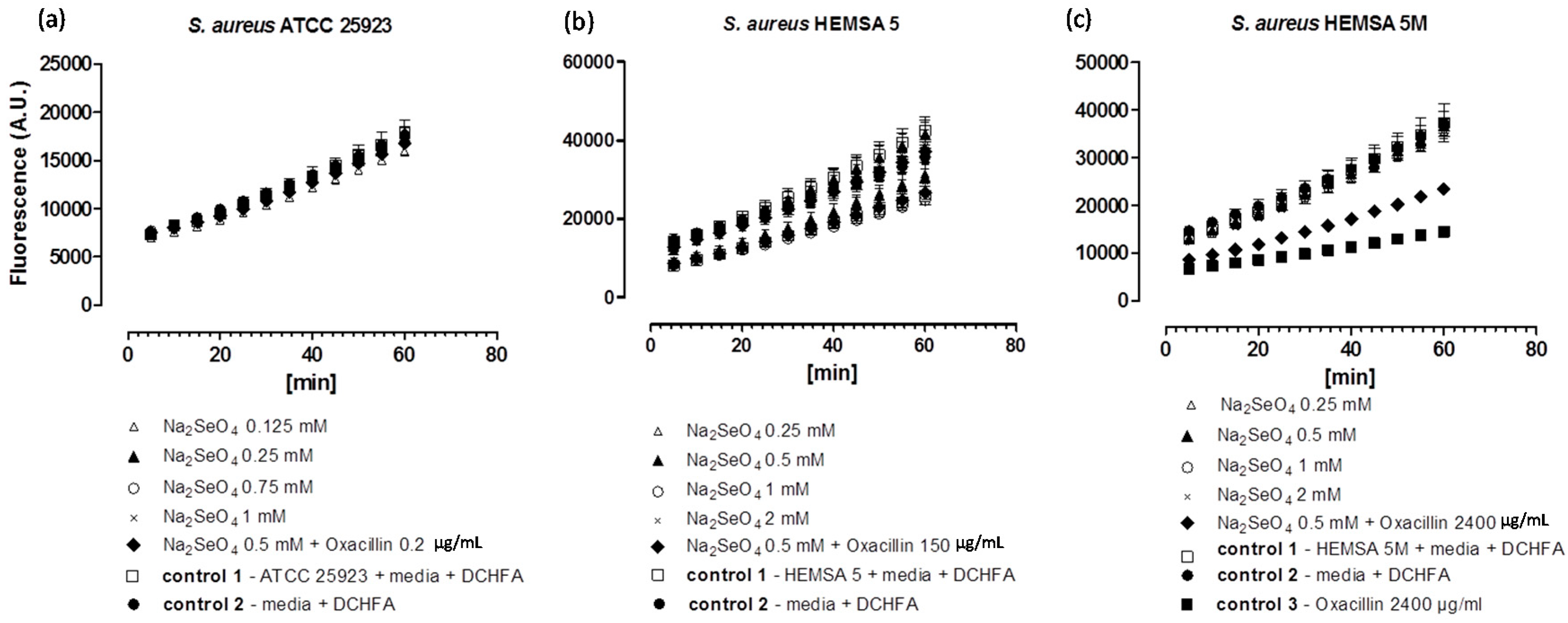 Generation of intracellular ROS by Na2SeO4 in different strains of S. aureus. ATCC 25923 (a); HEMSA 5 (b) and HEMSA 5M (c). See legend of Figure 2 for further details.