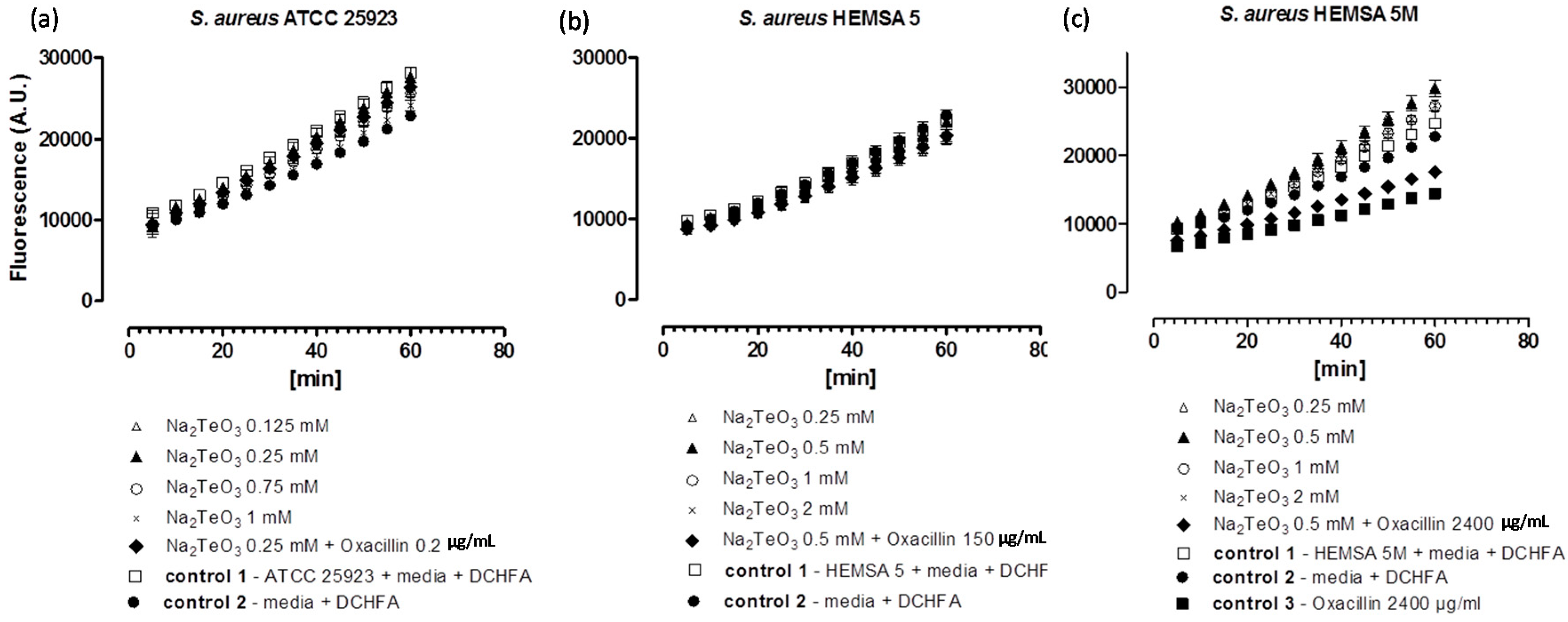 Generation of intracellular ROS by Na2TeO3 in different strains of S. aureus. ATCC 25923 (a); HEMSA 5 (b) and HEMSA 5M (c). See legend of Figure 2 for further details.