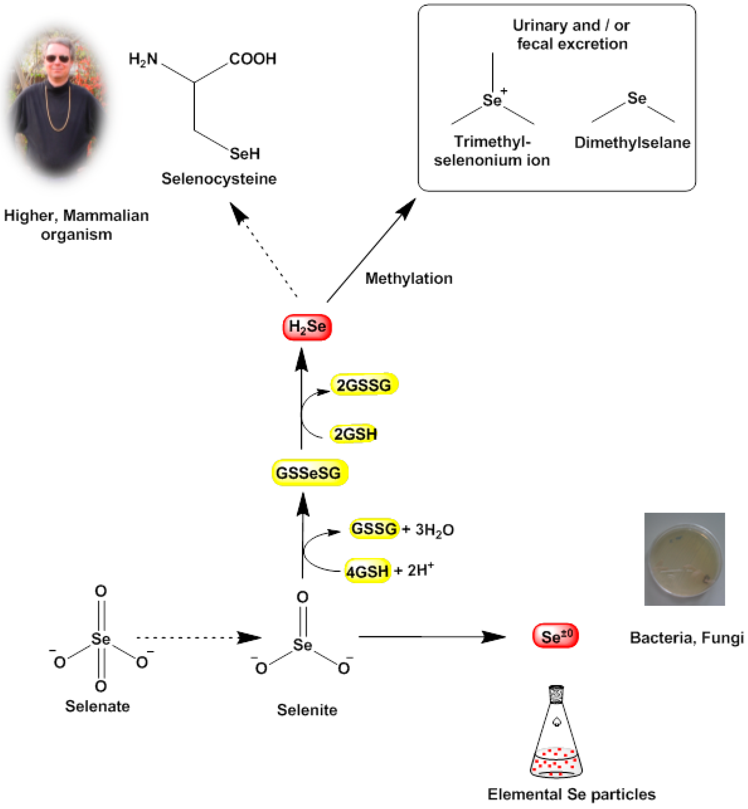 Indeed, the elemental precipitates formed not only stain the bacterial cells red or black, those particles also exert a massive mechanical stress on the bacterial cell which may ultimately cause cell death via a combination of mechanical stresses and unfavorable cellular responses toward them. Eventually, the bioreductive formation of these solid deposits in the bacterial cell may weaken the cell and hence may also explain—at least in part—the notable efficiency of traditional antibiotics in such compromised cells. This process may also contribute to the selective action of such simple chalcogen salts, as mammalian cells do not reduce selenite to elemental selenium. Here, selenite is mostly “sequestered” chemically by glutathione (GSH) in form of glutathione selenotrisulfide (GSSeSG). The latter is reduced further to hydrogen selenide (H2Se) which either serves as a selenium source for the synthesis of selenocysteine or is methylated to dimethylselenide (CH3SeCH3) and ionic trimethylselenonium ((CH3)3Se+) and excreted (Figure 5) [34,35]. In any case, mammalian cells normally do not form solid selenium or tellurium particles and hence are not affected by the mechanical stresses and toxicity caused by such particles [36].