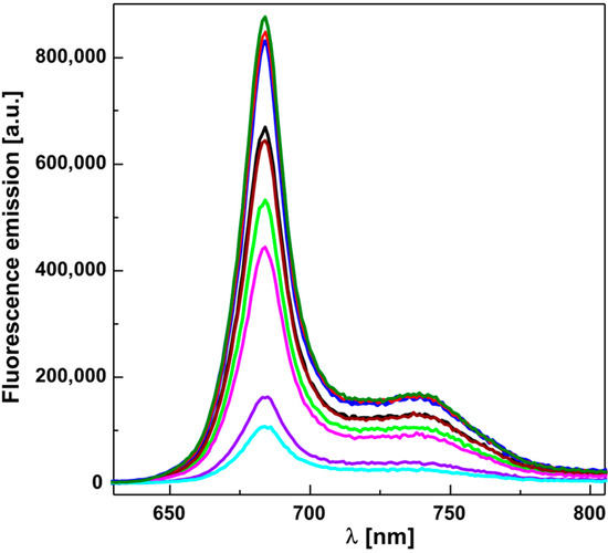 Fluorescence emission spectra of untreated spinach chloroplasts and those treated with 5 μmol/dm3 of studied compounds (from top to bottom: 4f—olive; 2c—red; 2a—blue; control sample—black; 3c—wine; 3e—green; 3b—magenta; 3d—violet; 2b—cyan).