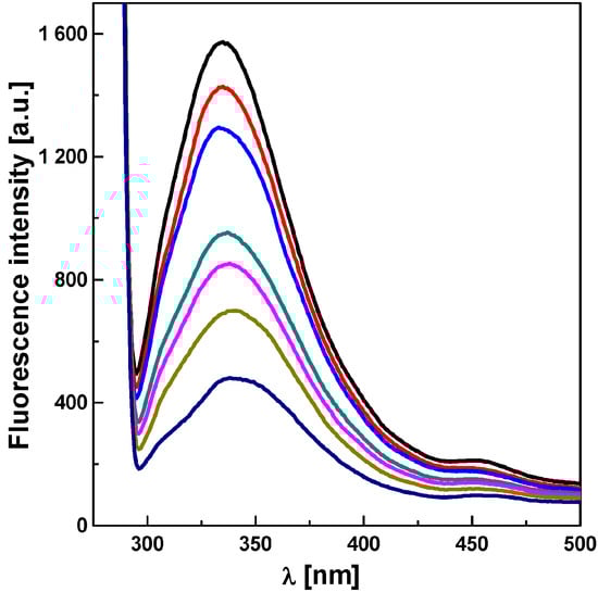 Effect of N′-[2,6-dinitro-4-(trifluoromethyl)phenyl]thiophene-2-carbohydrazonoyl chloride on fluorescence of chloroplast amino acids. Compound 3e was added to spinach chloroplasts to a final concentration of 0, 10, 20, 30, 40, 60, 80 μmol/dm3 (from top to bottom).