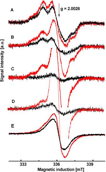 EPR spectra of untreated spinach chloroplasts (A) and those treated with 0.05 mol/dm3 of 2a (B); 2b (C); 3e (D) and 4f (E). Black curves indicate spectra registered in the dark. Red curves indicate spectra registered in the light.
