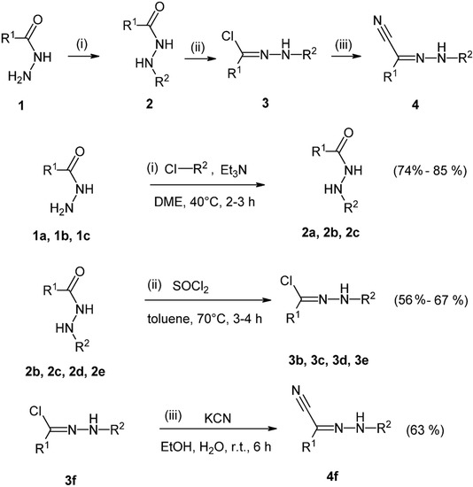 Hydrazides, hydrazonoyl halides and hydrazonoyl cyanides exhibit a wide spectrum of biological activities including antimicrobial [1,2,3,4,5,6,7], antifungal [8,9], antibacterial [8,10], antituberculotic [5,11], anticancer, anti-inflammatory and analgesic effects [12]. The biological activities and applications of hydrazone derivatives were comprehensively reviewed by Rollas and Küçükgüzel [13], Kumar and Narasimhan [14] and Narang et al. [15]. Some hydrazine derivatives induced DNA fragmentation [16] and exhibited mutagenic activity [17,18]. Hydrazides of aromatic aldehydes were found to be phytotoxic with specificity for Amaranthus retroflexus L. by absorption through the foliage [19]. N′-(4-methylphenylsulfonyl)-3-bromothiophene-2-carbohydrazonoyl chloride and 3-(4-benzyl-1-yl)-1-(toluene-4-sulfonyl)-1H-thieno[3,2-c]pyrazole were synthesized as dopamine D3 receptors [20]. Maleic hydrazide has been used in agriculture as a major commercial herbicide since 1950, however, later studies showed that it exhibits mutagenic effects [21,22].