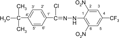 Hydrazine is an electron donor to the oxidizing side of photosystem II (PSII) and in photosynthesis it supports a light-dependent electron flow in chloroplasts inhibited at the water-oxidizing complex (WOC) [23]. Treatment of thylakoids with hydrazine permits a high population of the redox states S0, S−1, and S−2 in the water oxidase, a complex enzyme which integrates a photochemical reaction centre, PSII, and a catalytic centre, a manganese cluster [24]. According to Förster and Junge [25], two bridging ligands, possible Cl− or OH−, which normally connect two Mn nuclei, can be substituted by two molecules of hydrazine when the WOC resides in state S1. The reactivity of hydrazine with PSII depends strongly on redox state of WOC [26]. Treatment of chloroplasts with high hydrazine concentration (1 mmol/dm3) resulted in complete inhibition of water splitting reaction under flash light [27]. The dichlorophenol-indophenol (DCPIP) reduction by PSII in chloroplasts prepared from leaves of Phaseolus vulgaris L. was significantly decreased by maleic hydrazide treatment, while ferricyanide reduction activity was significantly accelerated and it was assumed that the site of action of maleic hydrazide is not situated in PSII but it is between cytochrome and plastocyanin on the donor side of PSI [28]. N′-phtalohydrazine and dichlorophenylhydrazine were found to be relatively efficient donors to PSII, although less efficient than hydrazobenzene [29]. The photosynthetic electron transpot (PET) inhibiting activity of hydrazones derived from furo[3,2-b]pyrrole-5-carboxhydrazides by their reactions with substituted furan-2-carboxaldehydes or thiophene-2-carboxaldehyde varied in the range from 0.071 to 2.060 mmol/dm3 and application of these compounds at concentrations 1–100 μmol/dm3 mostly did not affect significantly chlorophyll content in Chlorella vulgaris [30]. On the other hand, mixtures containing hydrazone compounds and copper were patented as suitable for controlling the growth of algae [31]. The ionophore carbonylcyanide-4-(trifluoromethoxy)phenylhydrazone acts as an uncoupler of ATP-ase, because it disrupts proton transport-coupled ATP synthesis [32,33].
