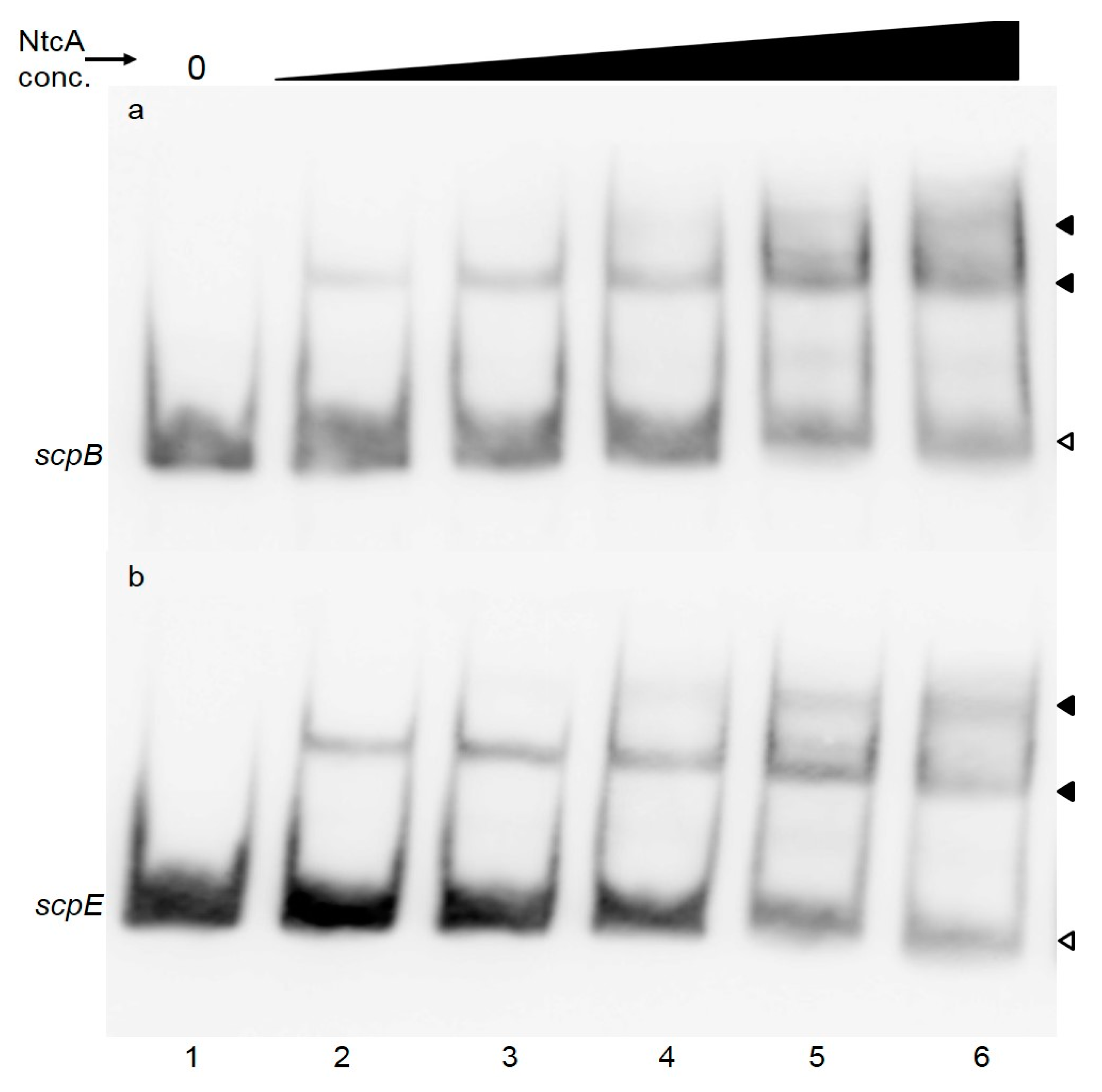 EMSA assay to verify NtcA binding to the scpB (a) or scpE (b) promotor regions. Purified recombinant NtcA from Synechocystis 6803 (2.5, 5, 7.5, 15 or 30 pmol—lanes 2–6) were incubated with 2 ng of labelled PCR fragments of the promoter regions of scpB (110 bp) (a) or scpE (90 bp) (b). In lane 1 labeled PCR product was loaded without any addition. White arrowheads point to unbound labeled DNA, black arrowheads to NtcA-DNA complexes.