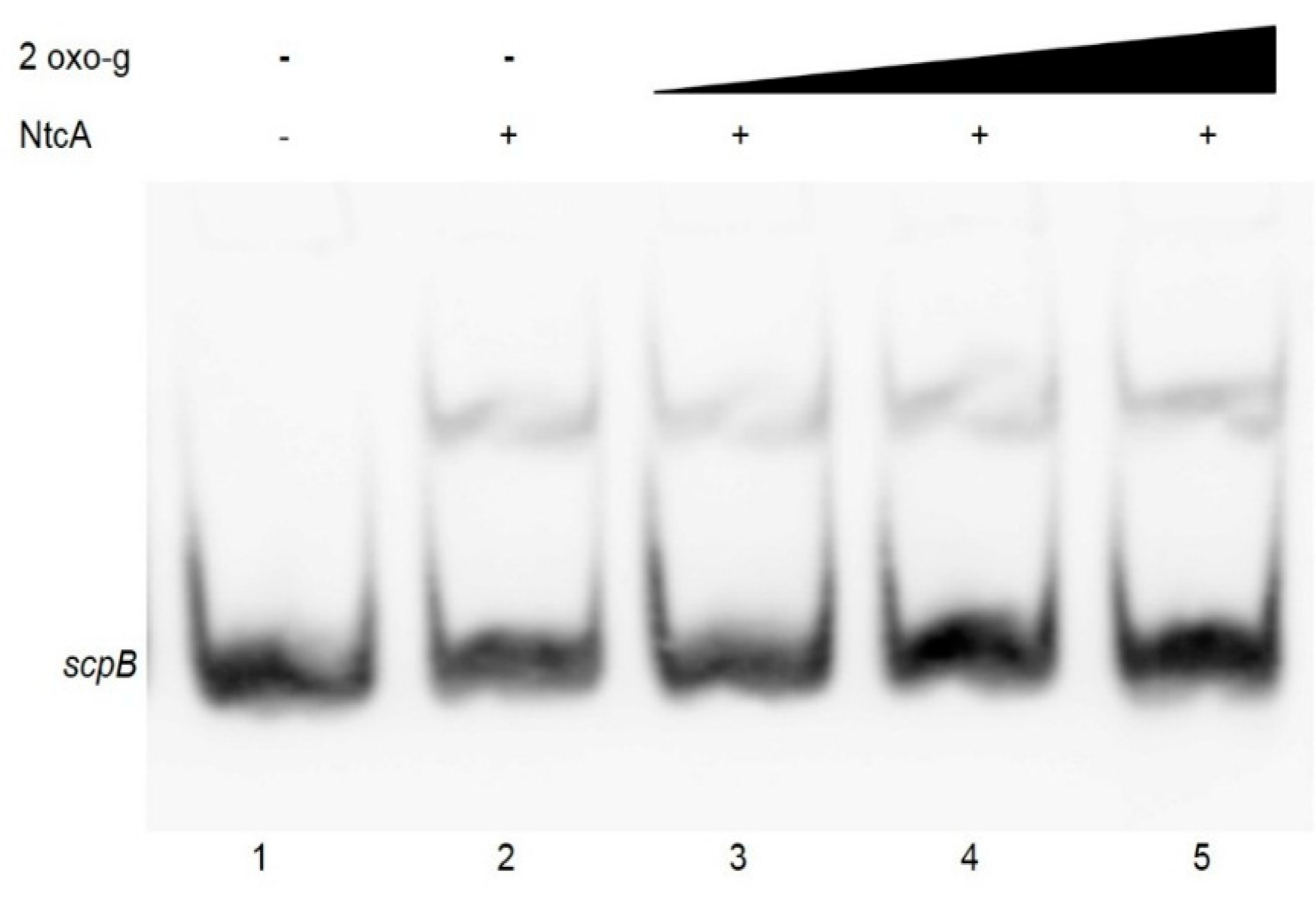 Effect of 2-oxoglutarate on NtcA binding to the scpB promoter sequence. EMSA was performed in the presence of 2 ng of a 110 bp labelled PCR fragment of the scpB promoter region, 7.5 pmol purified recombinant NtcA, 5 mM MgCl2 and 2-oxoglutarate at concentrations of 0.2, 0.6 or 1 mM (lanes 3, 4, 5). In lane 1 labeled PCR product of the scpB promoter region was loaded without any addition.