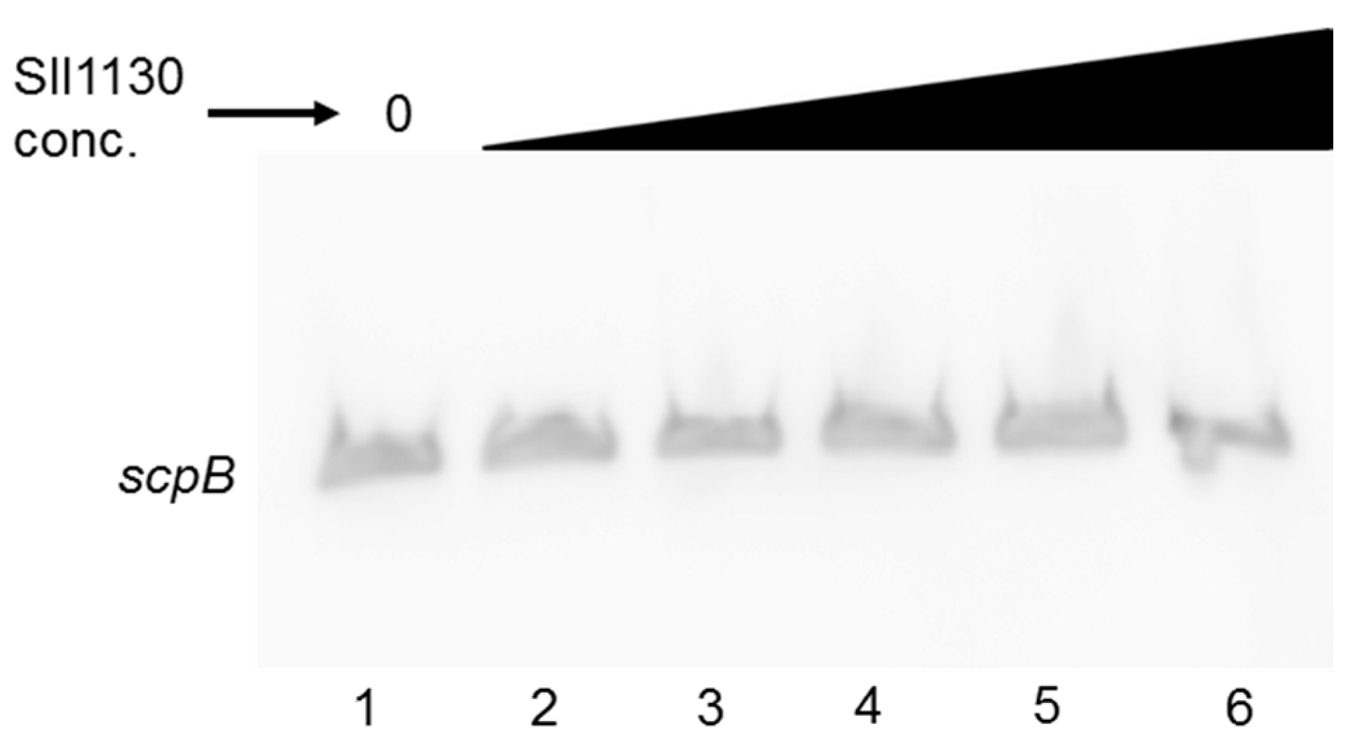EMSA assay to test the binding of Sll1130 to the HIP1 motif within the upstream region of scpB. Increasing amounts (0, 5, 10, 15, 30 or 100 pmol; lanes 1–6) of purified recombinant Sll1130 from Synechocystis 6803 were incubated with 2 ng of a 110 bp labelled PCR fragment of scpB.