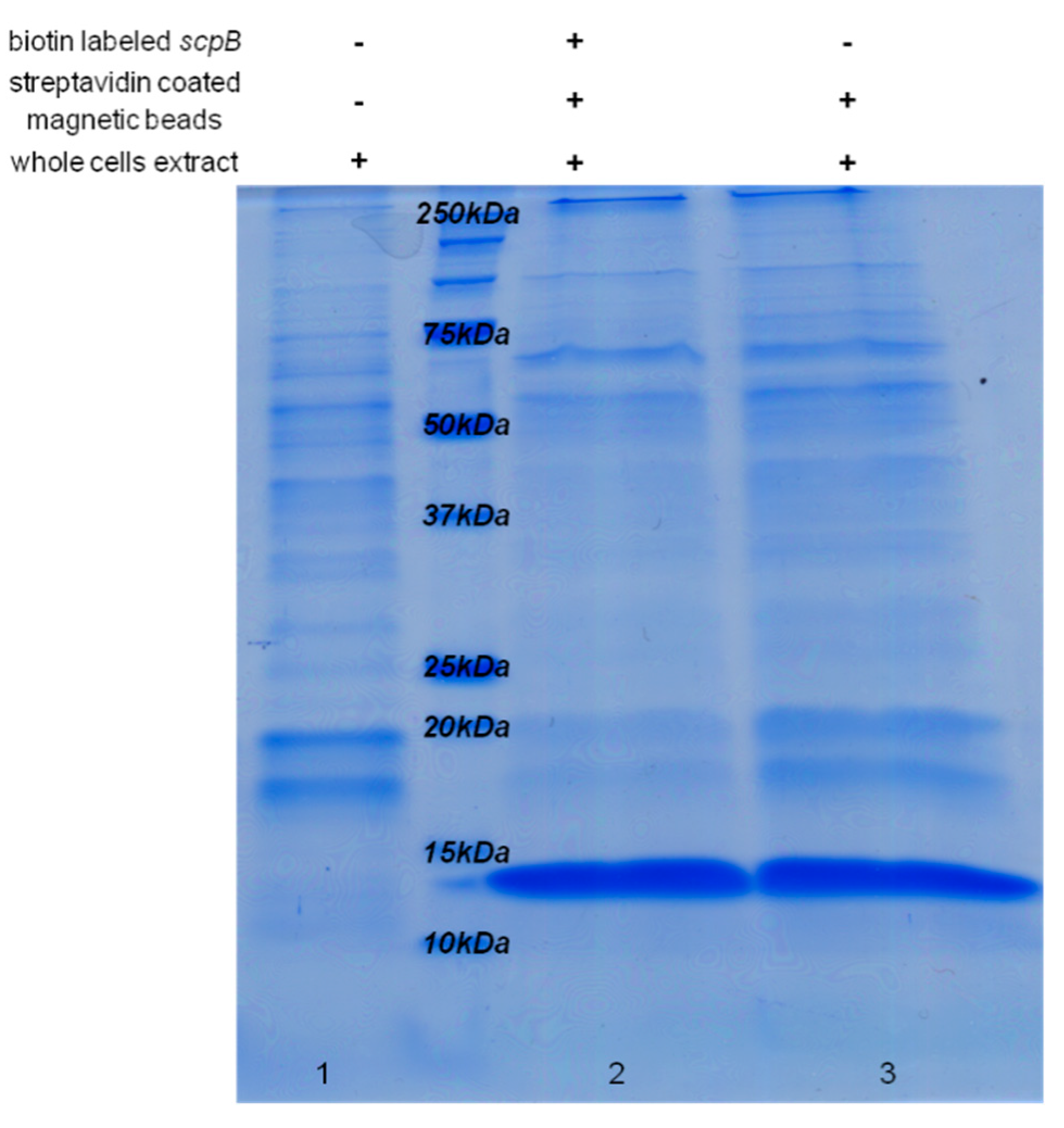 The functionality of the HIP1 binding site was then investigated by a DNA pull-down assay [46], which should detect any proteins/transcription factors binding to the HIP1 motif of the scpB upstream region. A 156 bp biotin-labeled fragment of the upstream region of scpB was synthesized by PCR and bound to streptavidin-coated magnetic Dynabeads® M-280 (Invitrogen Dynal AS, Oslo, Norway). After 15 min incubation with Synechocystis 6803 whole cell extracts, the beads were washed to eliminate unspecific bindings. The proteins were released by heating up the beads up to 95 °C and analyzed by SDS-PAGE (Figure 5). No difference could be observed in the protein pattern obtained in the presence or absence of labeled DNA, therefore binding of any protein to the biotin-labeled DNA fragments was not detected. However, one cannot exclude the situation in which a protein would bind the DNA fragment but due to the very low amount would not be detected by Coomassie staining. The intense protein band with molecular weight of 11 kDa (Figure 5, lanes 2 and 3) corresponds to streptavidin. An additional band with molecular weight of around 70 kDa was observed in the non-labeled sample, corresponding to bovine serum albumin (BSA) used in the binding buffer to suppress non-specific interactions.