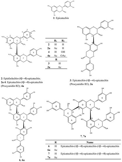Spectroscopic (NMR, ESI-MS, CD) identification of this trimer and further OPCs 6 to 10 obtained during subsequent isolation steps was performed after derivatization to the respective peracetates and comparison to published data. Due to a better resolution of the spectra it was also possible to assign the signals for the protons of the catechol ring for each of the three units in 6a and 7a. Additionally, signals of the carbon spectrum could be assigned, completing the spectroscopic data set for the peracetylated compounds [18,19].
