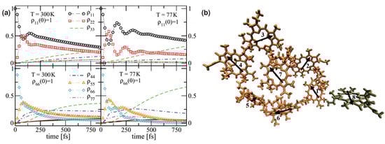 (a) Time-dependent occupation probabilities of all seven Fenna-Matthews-Olson (FMO) sites produced by quasiadiabatic propagator path-integral (QUAPI) method [45] for T = 300 and 77K with (0) = 1 and (0) = 1 for the measured FMO spectrum [19]; (b) The bacteriochlorophylls (BChls) a in an FMO monomer where the eighth BChl a is nearby the neighboring monomer. The arrows in panel (b) are the directions of transition dipole moments [52].