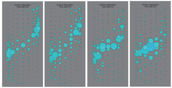 The large scale structure of the chlorosome antenna presents a great challenge for the simulation of exciton dynamics in the presence of dynamic disorder. Notwithstanding, by taking advantage of the parallel structure of GPU, it is now possible to solve the dynamics for this polaron ansatz encompassing thousands of interacting chromophores in a dephasing environment. In the case of modelling the acoustic phonon vibrations, the system contains N sites and N phonon modes. Therefore, the total number of variational parameters is with N complex numbers for the exciton amplitude at every site and complex numbers for the phonon displacement of every mode at every site. Regarding the computation time of this algorithm the simulation of 1 ps dynamics for 360 sites, 360 lattice modes (129,960 degrees of freedom) is accomplished in just 5.5 h (including energy dynamics, coherence size and error analysis calculations). The time scaling of the algorithm is found to grow slightly worse than linearly (computation time being the total number of degrees of freedom). This is possible by virtue of the highly parallel GPU implementation. Alternatively, in the case of very large systems, the total number of degrees of freedom may be significantly reduced by retaining only a reasonable number of phonon modes. This is the case when only a few phonon modes are strongly coupled to the system or precise knowledge of the environment’s spectral density is available. In that case the total number of variational variables is , which may be dramatically lower than . Figure 2 shows the snapshot of exciton dynamics at 260 fs in a lattice with interchromophoric couplings extracted from a model inspired by experimental characterization of the chlorosome. Due to the lack of consensus regarding the precise arrangement of chromophores in the chlorosome, several structural motifs (Figure 2) such as distance dimerization along the rod axis and vertical shifts providing helical pathways are analysed independently and their optical and diffusion properties are compared to each other. Super-diffusive behavior is found in every case during the first 400 fs, although the addition of static disorder will severely decrease the extent of this regime. The corresponding exciton populations as well as phonon displacement for dimer shift model of rod aggregates with 25 rings and 18 sites per ring are shown in Figure 3.