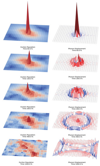 Polaron dynamics in a 18 × 25 lattice. Exciton populations are shown at left and phonon displacements at right. Interchromophoric couplings have been calculated according to the dimer-shift model of rod aggregates for 25 rings, 18 sites per ring. Logarithmic normalization has been applied to the colormap of exciton dynamics to stress differences among sites. Nevertheless, total diffusion on the same complex occurs in less than 400 fs. The rod structure has been folded into a plane for easier illustration