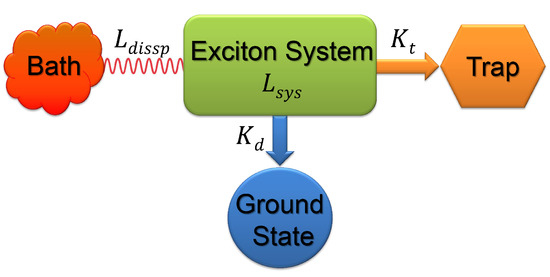 Coherent and incoherent hopping dynamics have been treated by kinetic mapping of quantum dynamics that includes high-order corrections [14]. It was found that the dissipative effects of the environment can be optimized to yield a maximal efficiency, and the modulation of the efficiency arises from the interference between energy transfer pathways and exists in networks that form at least one closed loop. A simple model for describing the excitonic dynamics in typical natural light harvesting systems is shown schematically in Figure 4. The exciton generated upon illumination, which is treated as the system, is dissipated by the coupling to the environment and may face non-radiative decay to ground state apart from its desired fate of utilization by the reaction center, referred to as the trap. Hence, the exciton dynamics for the light harvesting system follows the Liouville equation [14,81,82],