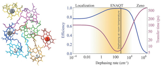 The most intriguing finding from recent experimental and theoretical investigations is the possible role of environmental noise in assisting quantum transport such that the intricate system-environment interaction may even lead to optimization of energy transfer efficiency (ETE) [7,8,9,85,88,108,109,110,111,112,113,114]. The Haken-Strobl model based study of quantum transport in the FMO complex by Rebentrost et al. revealed that ETE can be enhanced by a dynamical interplay of the system with pure dephasing, induced by a fluctuating environment [85]. The left panel in Figure 5 depicts the quantum transport network structure of the pigments in FMO complex, in which pigments 1 and 6 bear the initial state while pigment 3 assumes the role of final trapping site. The right panel in Figure 5 presents the efficiency and transfer time as a function of the pure-dephasing rate. It was argued that the intrinsic static disorder in the system suppresses transport if the noise levels are low. At very high noise levels as well, decoherence effectively produces “watchdog effect” (quantum Zeno effect [115]) that suppresses transport. However, at intermediate noise levels the dephasing noise and quantum coherent effects act harmoniously to achieve an optimal quantum efficiency, manifesting the so-called environment-assisted quantum transport (ENAQT). Although it is only applicable to describe Markovian bath fluctuations, Haken-Strobel model generally captures the dephasing behavior of fluctuating environment in the high temperature limit sufficiently well. In order to circumvent this infinite temperature assumption in the Haken-Strobl model and the failure of Redfield approach in intermediate or highly dissipative regime, Wu et al. applied the generalized Bloch-Redfield (GBR) equation to systematically investigate the quantum efficiency of the FMO protein complex and phycocyanin 645 (PC 645) under various physical conditions, including temperature, reorganization energy and spatial-temporal correlations in noise [116]. They found that the maximal ETE is achieved at an intermediate level for various variables. The reorganization energy and the bath relaxation rate (the inversion of bath temporal correlation), in particular, yield a nonmonotonic dependence and thus lead to optimal ETE, albeit only under certain dissipation strength regimes. The HEOM method was also applied to investigate the EET in a dimer system [117] and an optimal energy transfer rate was obtained with medium reorganization energy. Calculated energy transfer rates agree with the results from Redfield equation with extremely small reorganization energy and coincide with the Förster rate in the large reorganization energy region. It is interesting to note that the seven-pigment model structure of the FMO complex employed by the aforementioned studies on the EET efficiency turned out to be inaccurate in the light of the most recent crystallographic analysis. The existence of an eighth chromophore, which is thought to serve as a link between the chlorosomes and remaining seven chromophores was discovered [118,119]. The influence of this additional bacteriochlorophyll (Bchl) on the dynamics and efficiency of FMO was soon incorporated in a study based on GBR and noninteracting blip approximation (NIBA) [120]. The results showed that the population oscillations observed between sites 1 and 2 in the seven site model may be completely suppressed in the eight site model. They attribute the suppression of the population oscillations to the large energy difference between site 8 and the remaining sites. The resulting initial conditions for sites 1 and 2 are effectively incoherent distributions, and it is this dephasing that suppresses the population oscillations.