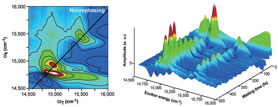 Although most of the recent work is based on the FMO complex as a prototype system to study electronic quantum coherence, researchers have also ventured on the quest to find if such long-lasting quantum coherence is a universal phenomenon. Lee et al. carried out two-color photon echo experiments on the RC of purple bacterium Rhodobacter Sphaeroides [108], and found dephasing times of 440 and 310 fs at 77 and 180 K, respectively, which are substantially longer than the experimentally estimated excitation energy transfer time scale of about 250 fs [129]. They ascribed the observed long-lasting quantum coherence to the strong correlation between the protein-induced fluctuations in the transition energy of neighboring chromophores, and suggested that correlated protein environments allow the excitation to move coherently in space, thereby enabling highly efficient energy harvesting and trapping in photosynthesis. Calhoun et al. applied 2DES to determine the energy landscape in LHCII [12], the most abundant antenna complex in plants containing approximately 50% of the chlorophylls on Earth. LHCII has a trimeric structure in which each monomer contains eight chlorophyll a (Chla) and six chlorophyll b (Chlb) molecules [130]. They explored the 2D nonrephasing spectra by taking advantage of the fact that only the diagonal signals arising from quantum coherence appear in nonrephasing 2D spectra [131]. The left panel of Figure 6 shows the real part of the nonrephasing 2D spectrum at a waiting time 250 fs, and the right panel of Figure 6 depicts the amplitude of the diagonal cross-section of the nonrephasing 2D spectra as a function of waiting time. Quantum beating due to quantum coherence is clearly visible in both Chl-a and -b regimes (corresponding to the low energy and high energy regimes, respectively). By Fourier-transforming the diagonal amplitude of nonrephasing 2D spectra (Figure 6, right panel) along the waiting time axis, they obtained the coherence power spectrum through which the exciton levels can be easily determined.