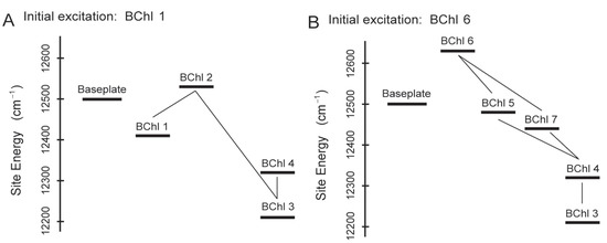 The energy landscapes along the two primary transfer pathways in the FMO complex: baseplate → BChls1 → 2 → 3 → 4 (A) and baseplate → Bchls6 → 5,7,4 → 3 (B) the relatively strong couplings between BChls are depicted by solid lines [26].