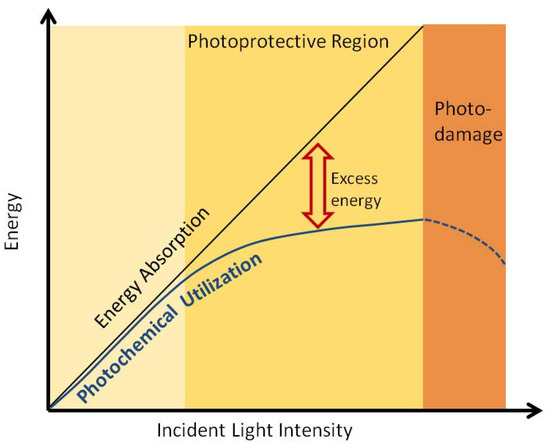 In a remarkable feat attained during the millennia of their evolution, photosynthetic organisms ensure optimal functionality even under disparately varying ambient conditions such as fluctuating intensity of incident radiation. Underlying the complex molecular structure and organization of the natural photosynthetic machinery is generally a clear division of light capture and chemical conversion to different functional units. This inherently demands a need for balance between the two distinct processes. Typically the functional units for light capture, i.e., antenna complexes, greatly outnumber the RCs, e.g., in the thylakoid membranes of chloroplasts in green plants. The chemical conversion in the RCs is the rate limiting step, particularly in the photosystem II. As a result, whenever plants are exposed to light of intensity higher than optimal, the capacity of utilization of excitation energy quickly saturates whereas the capacity for solar photon absorption remains the same, as shown schematically in Figure 8. The excess excitation energy in such a scenario can prove detrimental to plants since it leads to formation of long lived triplet states of Chl by inter-system crossing eventually giving rise to highly reactive singlet oxygen species that degrade the protein environment and damage the photosynthetic machinery [149]. To prevent this dangerous situation that, in fact, is experienced frequently by plants, evolution has developed a regulatory process known as non-photochemical quenching (NPQ) [2]. This process dissipates the excess energy in a harmless manner as heat. When the trigger for this mechanism to kick-in subsides, i.e., ambient light intensity returns to normal, the original energy conversion functionality of the photosynthetic apparatus gets restored quickly. Among the multiple components of such photoprotective pathway that are characterized by different timescales, the rapidly reversible energy dependent quenching process, also known as qE, is the most significant. In the following discussion, we will adopt the phrases qE and NPQ interchangeably.