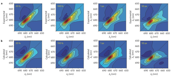 - Fuller, F.D.; Pan, J.; Gelzinis, A.; Butkus, V.; Senlik, S.S.; Wilcox, D.E.; Yocum, C.F.; Valkunas, L.; Abramavicius, D.; Ogilvie, J.P. Vibronic Coherence in Oxygenic Photosynthesis. Nat. Chem. 2014, 6, 706–711. [Google Scholar] [CrossRef] [PubMed]