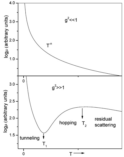 where represents band-like transport (coherent charge transfer) that dominates at low temperatures, and is related to hopping transport that mainly takes place in the high temperature regime. Figure 11 shows temperature dependence of mobilities in the weak and strong electron-phonon coupling regimes as predicted by the Holstein model. In the case of weak coupling (), the charge transport is dominated by band-like transport mechanism () across the entire temperature range. For intermediate coupling (), mobility exhibits band-like behavior at low temperatures, while temperature dependence of mobility becomes much weaker at high temperatures [250]. For strong coupling (), three distinct regimes appear showing band-like behavior for the low temperature () regime, hopping mechanism at the high temperature regime, and a crossover from band-like transport to hopping transport in the intermediate regime. When temperature reaches a very high value () at which the thermal energy itself can dissociate the polaron, the residual scattering effects come into picture causing lowering of the mobility.