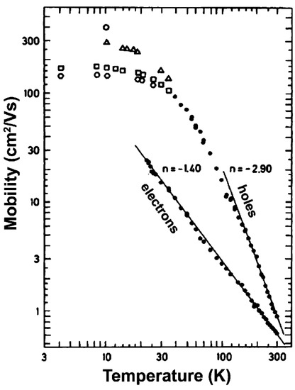 Electron and hole mobilities in ultrapure naphthalene as a function of temperature. The applied electric field is approximately parallel to the crystallographic a direction [261].