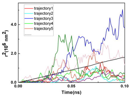 Square displacement of individual trajectory versus the transport time. The straight line is the average values of the square displacements versus time [272].