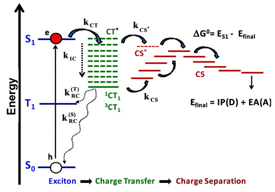 - Jailaubekov, A.E.; Willard, A.P.; Tritsch, J.R.; Chan, W.L.; Sai, N.; Gearba, R.; Kaake, L.G.; Williams, K.J.; Leung, K.; Rossky, P.J.; et al. Hot charge-transfer excitons set the time limit for charge separation at donor/acceptor interfacs in organic photovoltaics. Nat. Mater. 2013, 12, 66–73. [Google Scholar] [CrossRef] [PubMed]