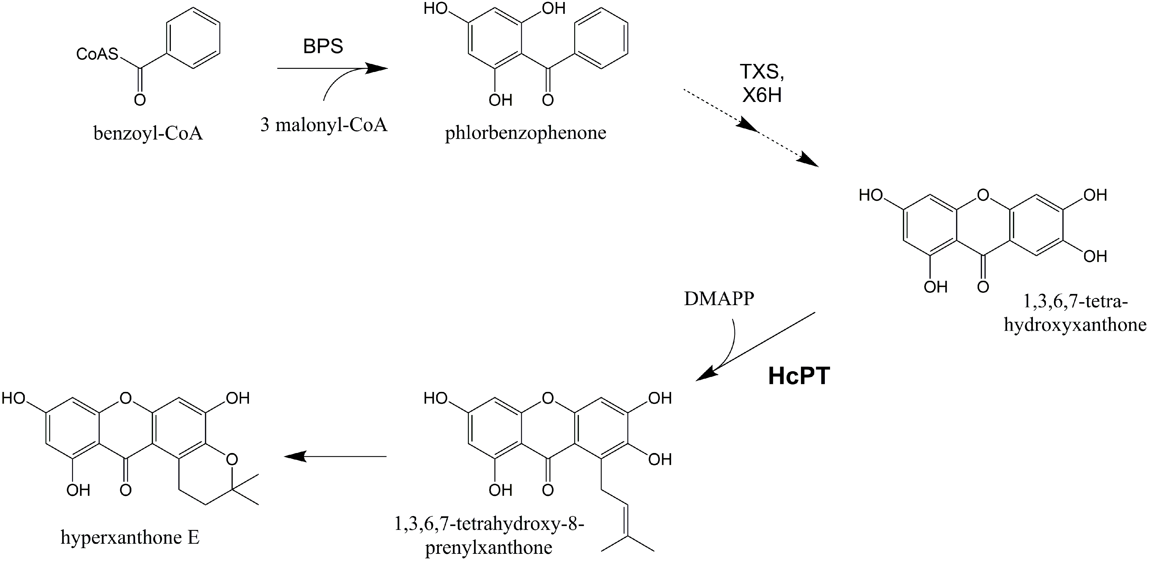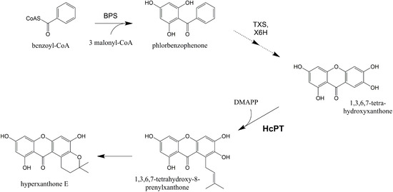 - Gaid, M.M.; Sircar, D.; Müller, A.; Beuerle, T.; Liu, B.; Ernst, L.; Hänsch, R.; Beerhues, L. Cinnamate:CoA ligase initiates the biosynthesis of a benzoate-derived xanthone phytoalexin in Hypericum calycinum cell cultures. Plant Physiol. 2012, 160, 1267–1280. [Google Scholar] [CrossRef] [PubMed]